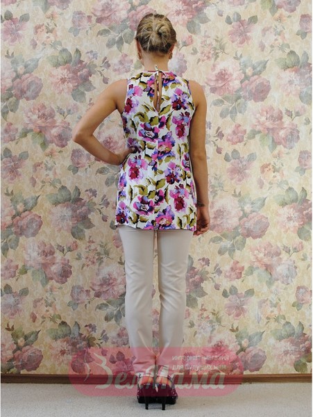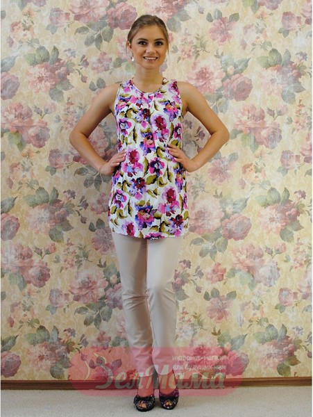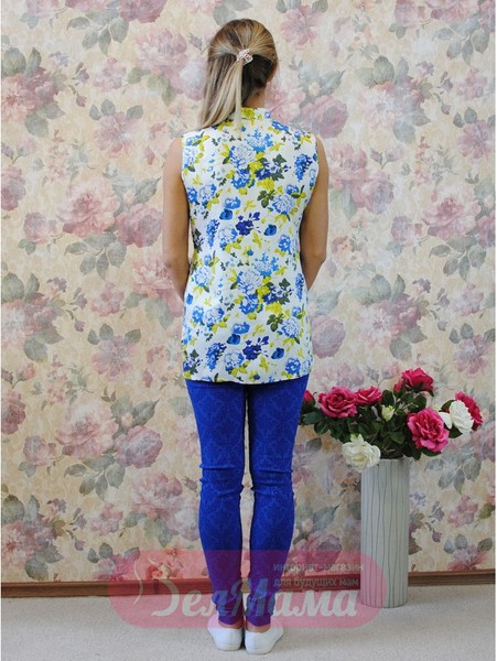 Летняя стильная рубашка без рукавов для беременных. Модель выполнена из штапельного полотна красивой расцветки. Такую  лучше всего надевать с брюками или джинсами. Рубашка  довольно широкая, поэтому ее можно носить до самых родов и после рождения малыша. Блузка имеет V-образный вырез, воротник стойку, планку на пуговицах и отрезной лиф со сборкой под грудью.