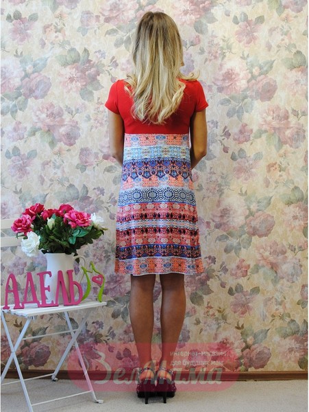Замечательное  летнее и яркое платье для беременных с коротким рукавом. Имитация болеро из однотонной ткани яркого цвета, делает модель очень женственной и привлекательной. Специальные складки под грудью дают свободу растущему животику, не стесняя его. Платье можно надевать и на работу и для деловых встреч, стоит всего лишь правильно подобрать к нему подходящие украшения и аксессуары. Изделие  выполнена из вискозы с добавлением эластана, поэтому оно совсем неприхотливо в уходе.